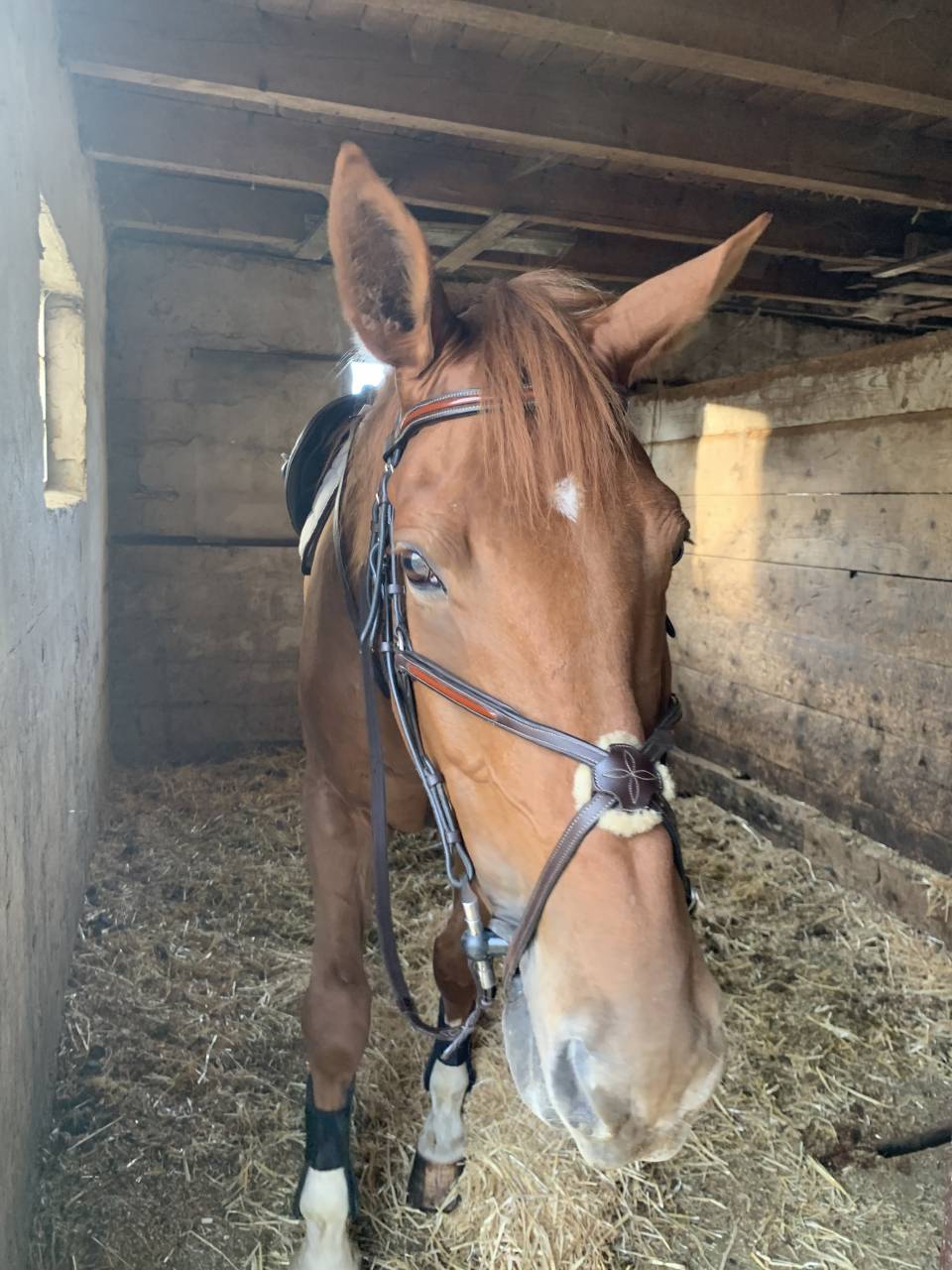 À vendre filet Greenfield nu muserolle croisé marron très bonne état , taille cheval, taille grand vendu sans rênes sans mors peu être vendu avec moumoute de la muserolle croisé. Vendu neuf 115 euros