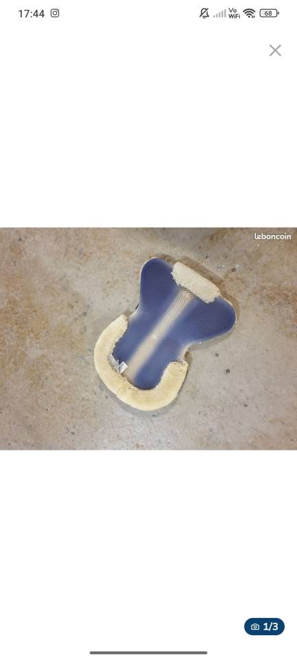 Amortisseur Fouganza en gel à mémoire de forme blanc et moumoute synthétique ,porté une fois, mais ayant une selle en synthétique la couleur de la selle à déteint sur l'amortisseur mais à part ce détail il est en parfait état