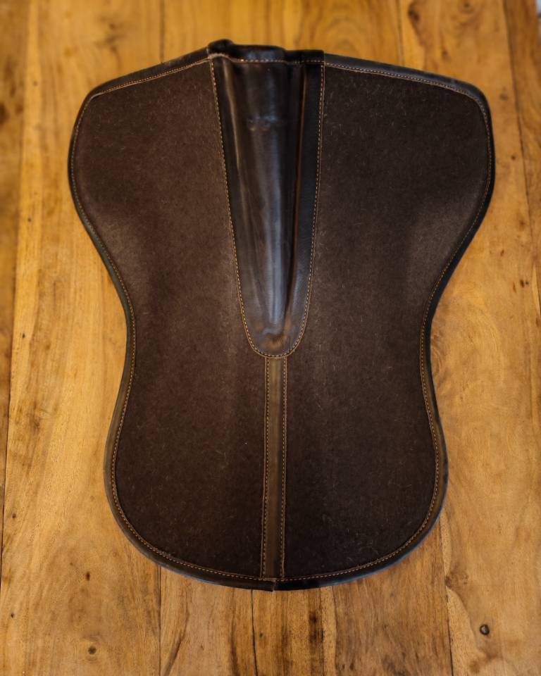 Amortisseur de dressage de marque CHILDERIC en feutre 5mm marron avec rembord en cuir marron.
