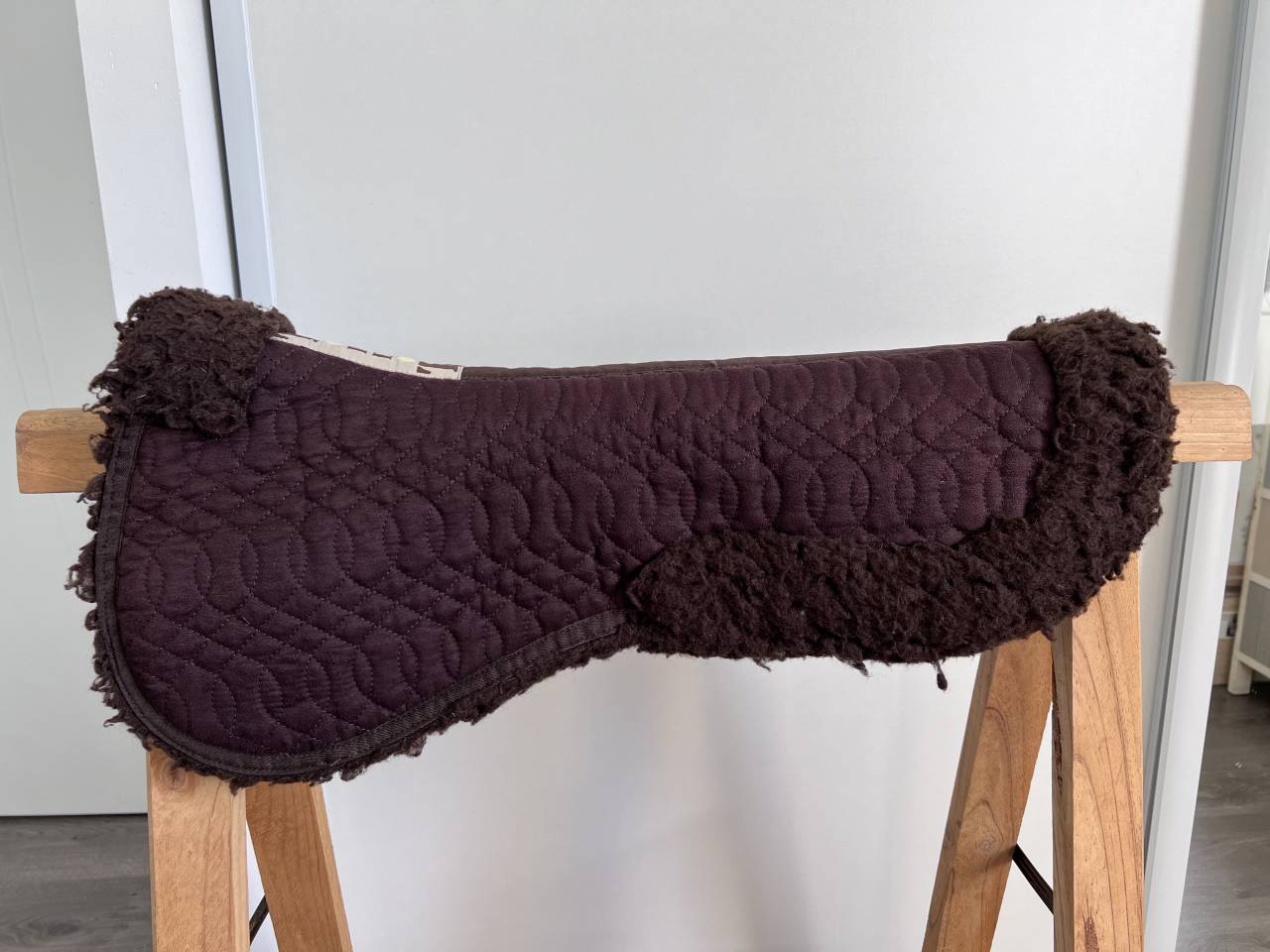 amortisseur marron T de T en bon état, taille cheval, mouton synthétique dessous et aux contours de selle. Il reste des poils que je n’ai pas réussi à enlever avant et après lavage (voir photos).