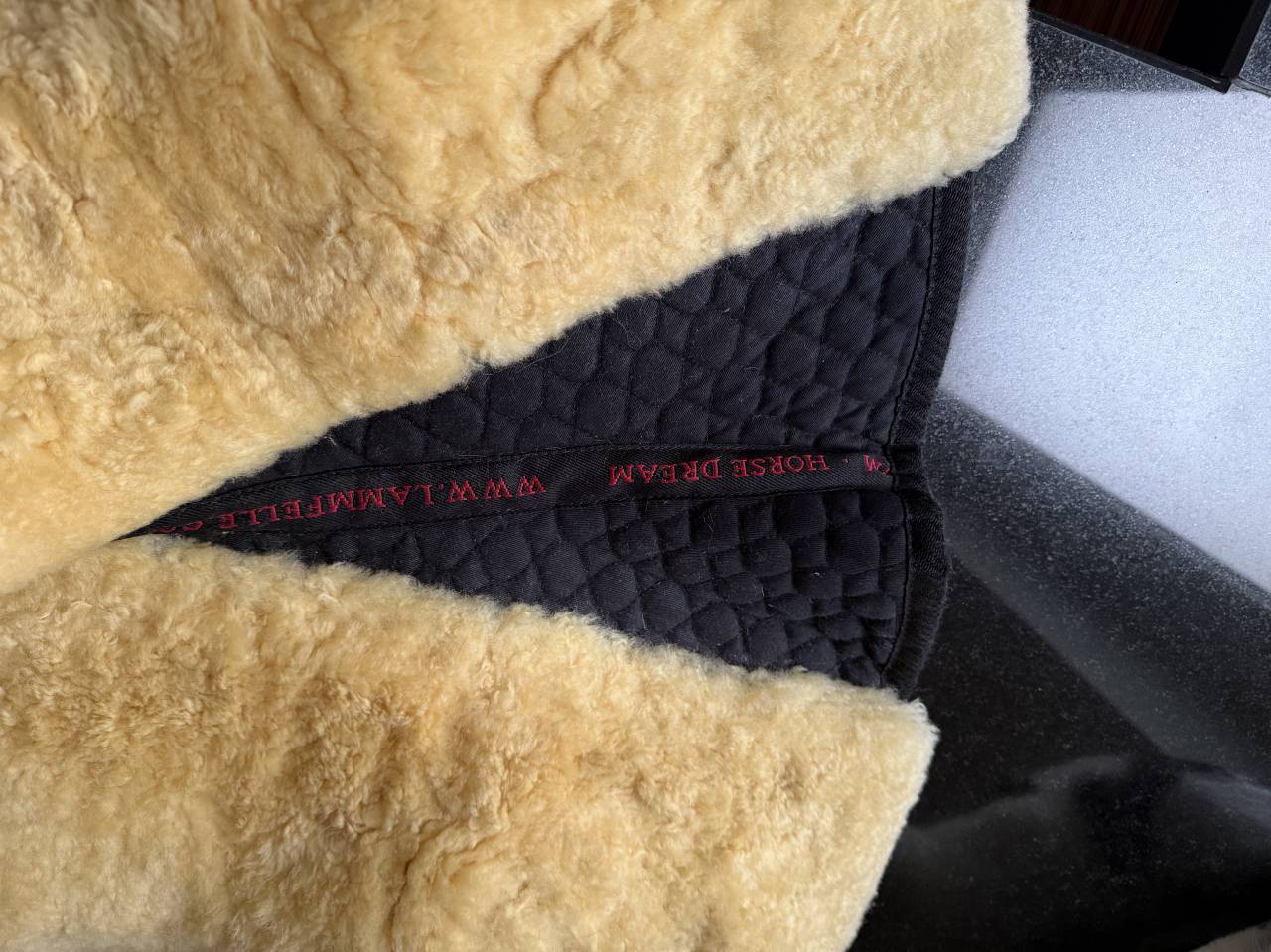 Amortisseur taille cheval en véritable mouton écru et coton noir. Avec ligne de dos sans garniture pour protéger le dos, adapté aux chevaux avec un fort garot. 2 sanglons scratch pour accrocher l'amortisseur à la selle. Presque neuf, utilisé une seule fois, le mouton est parfaitement propre et le coton sans accroc.