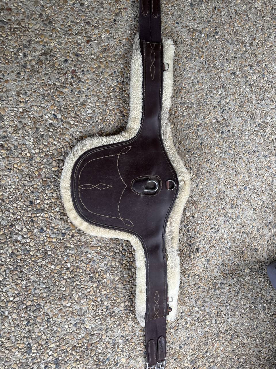 Bavette cuir, avec renfort et confort en mouton à l'intérieur, en scratch lavable. Sanglons élastiques de chaque côté.