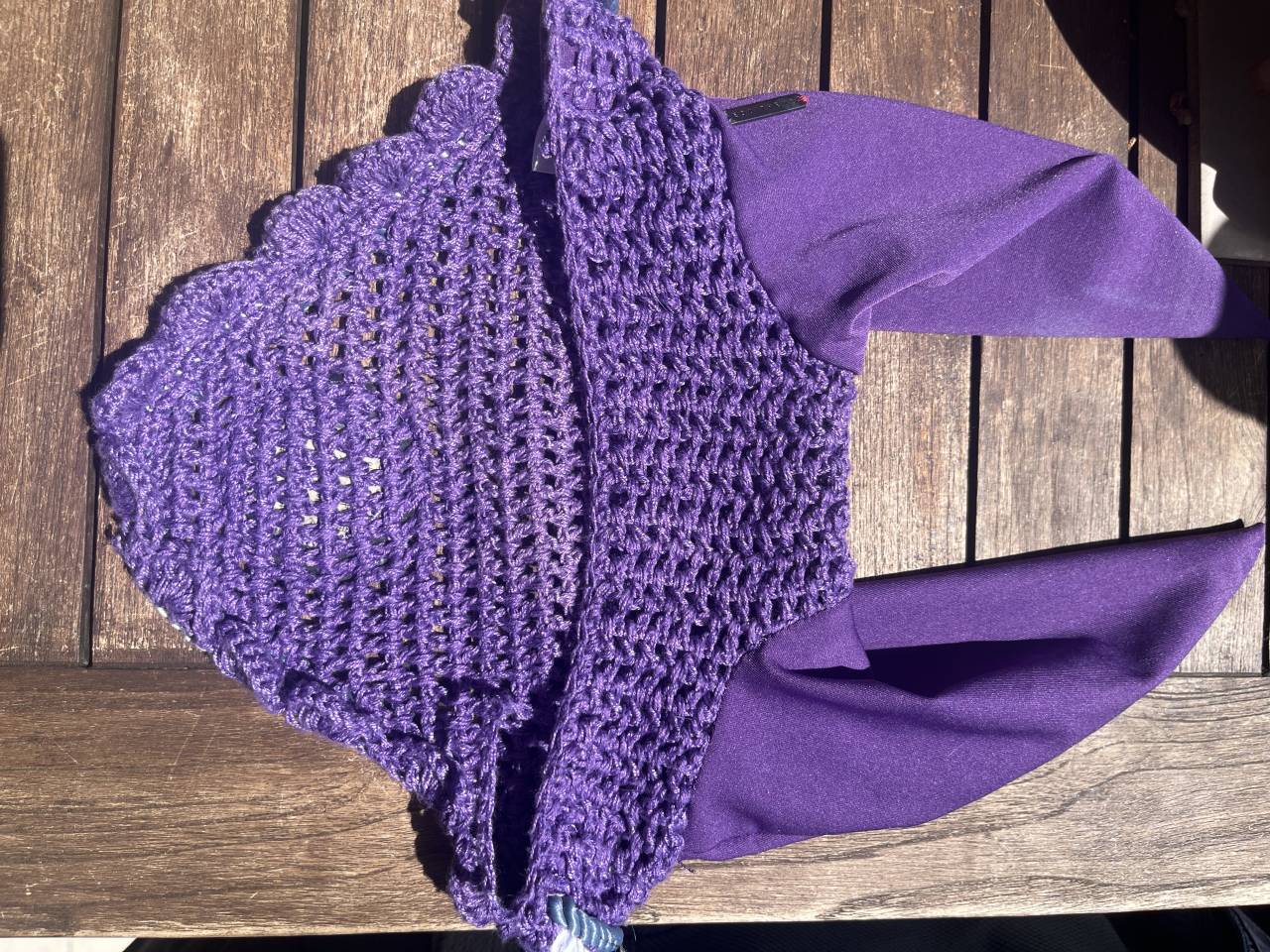 Bonnet anti-mouches Equitheme violet avec un liseré blanc et un bleu très peu porté (5 fois environ )
