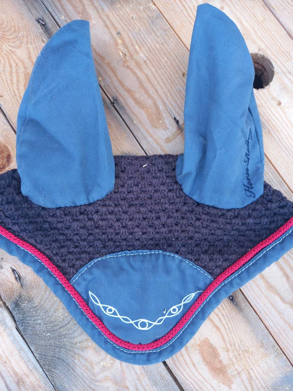 Bonnet anti-mouche Fouganza, bleu marine avec cordelette rouge, taille cheval. A servi mais en bon état