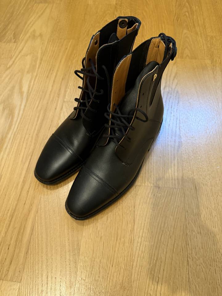 Paire de boots d'équitation neuves, marque PETRIE, en cuir noir, taille 40 (française), à lacets et zip arrière