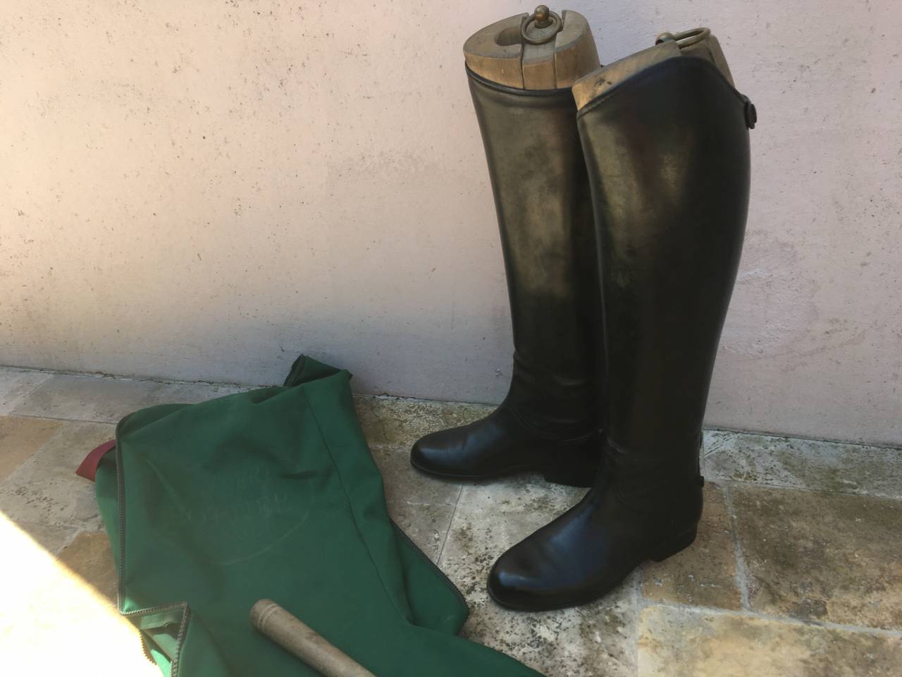 Paire de bottes en cuir sur mesures comme neuves, très peu portées, seulement en concours. Joël Albert est bottier à Saumur. Equipées de leurs embauchoirs en bois qui préservent la forme des bottes. Vendues avec leur housse facilitant le transport. Fermeture Zip arrière. Pointure 37/38 Hauteur tige : 45 cm Tour de mollet : 39 cm Visibles à Lyon. Remise en mains propres