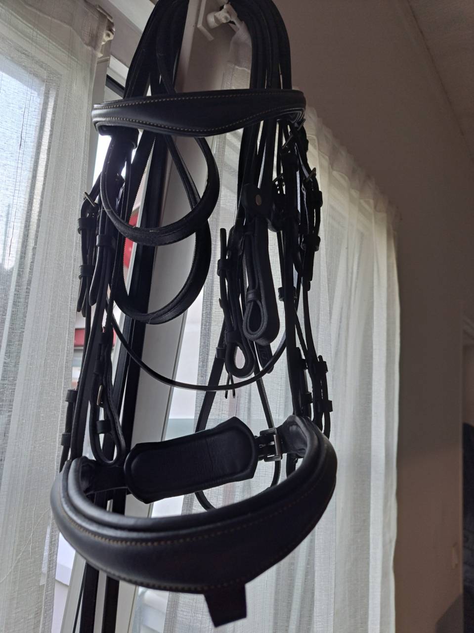 vends bride de dressage, convenant à chevaux standard et grands poneys D .Vendue sans embouchures et sera fraichement lavée et graissée pour son depart. 2 paire de renes fournies, une hunter ( caoutchouc interieur) une cuir lisse. Cuirs en bon état général car bien entretenus. Tétière anatomique, musserolle pull back. doublée veau. Modifiable rapidement en bridon simple grace au montant de bride enlevable en un clin d'oeil.