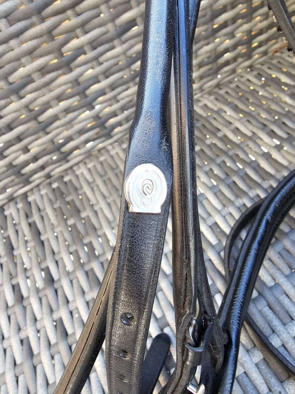 Cuir rond noir, 2 paires de rennes incluses, frontal avec brillants Swarovski, muserolle noire laquée brillante.