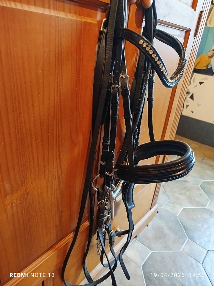 Je vend ma bride taille cob, elle est en bonne état seul les rênes de filet on le caoutchouc qui a été abîmé du aux années d'utilisation.
