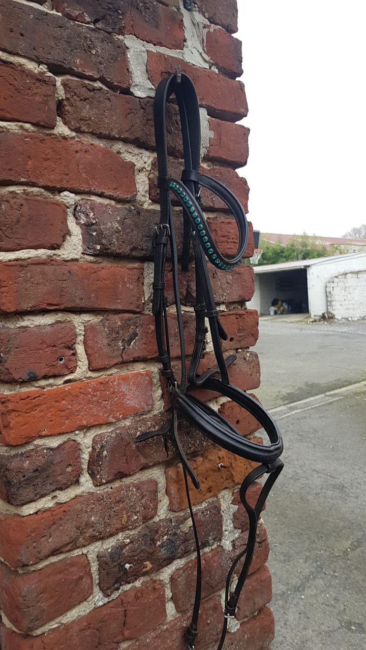Bridon en cuir noir avec frontal vague en strass bleu turquoise taille cheval en très bon état