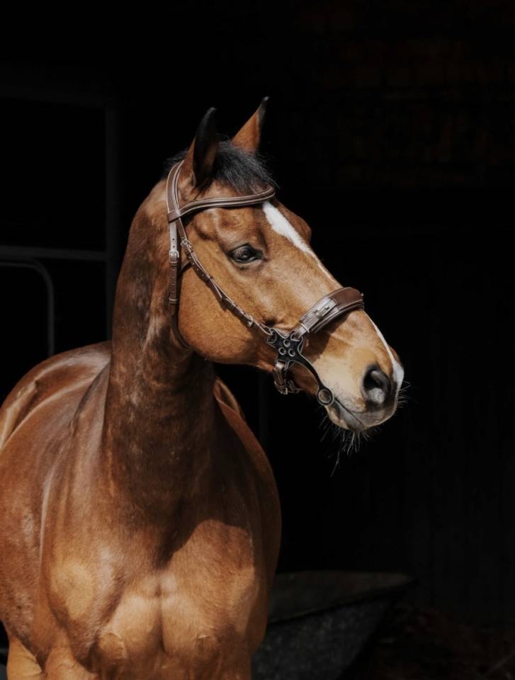 👉🏼 Bridon Hackamore, couleur havane, cuir de buffle et doublé de cuir de vachette au niveau de la muserolle, du frontal et de la têtière, taille cheval