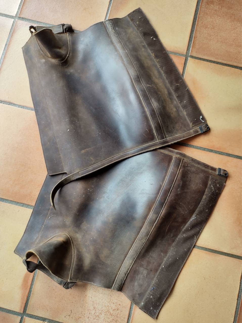 Paire de chaps Argueyrolles, cuir gras de qualité introuvable, bande velcro très solide, seul élastique sous le pied se détend.