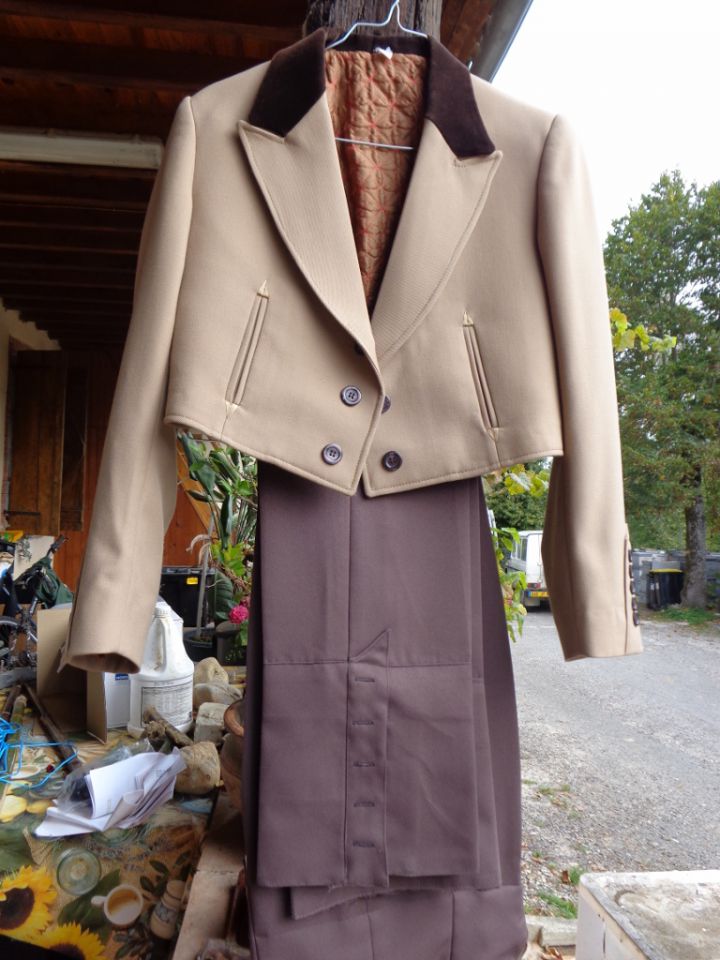 Costume de la marque UBALDO  comportant une veste beige avec un col marron , doublure marron clair surpiquée, une poche intérieure. Sur chaque manche 5 boutons marrons en corne. Taille 42 . Très bon état.
