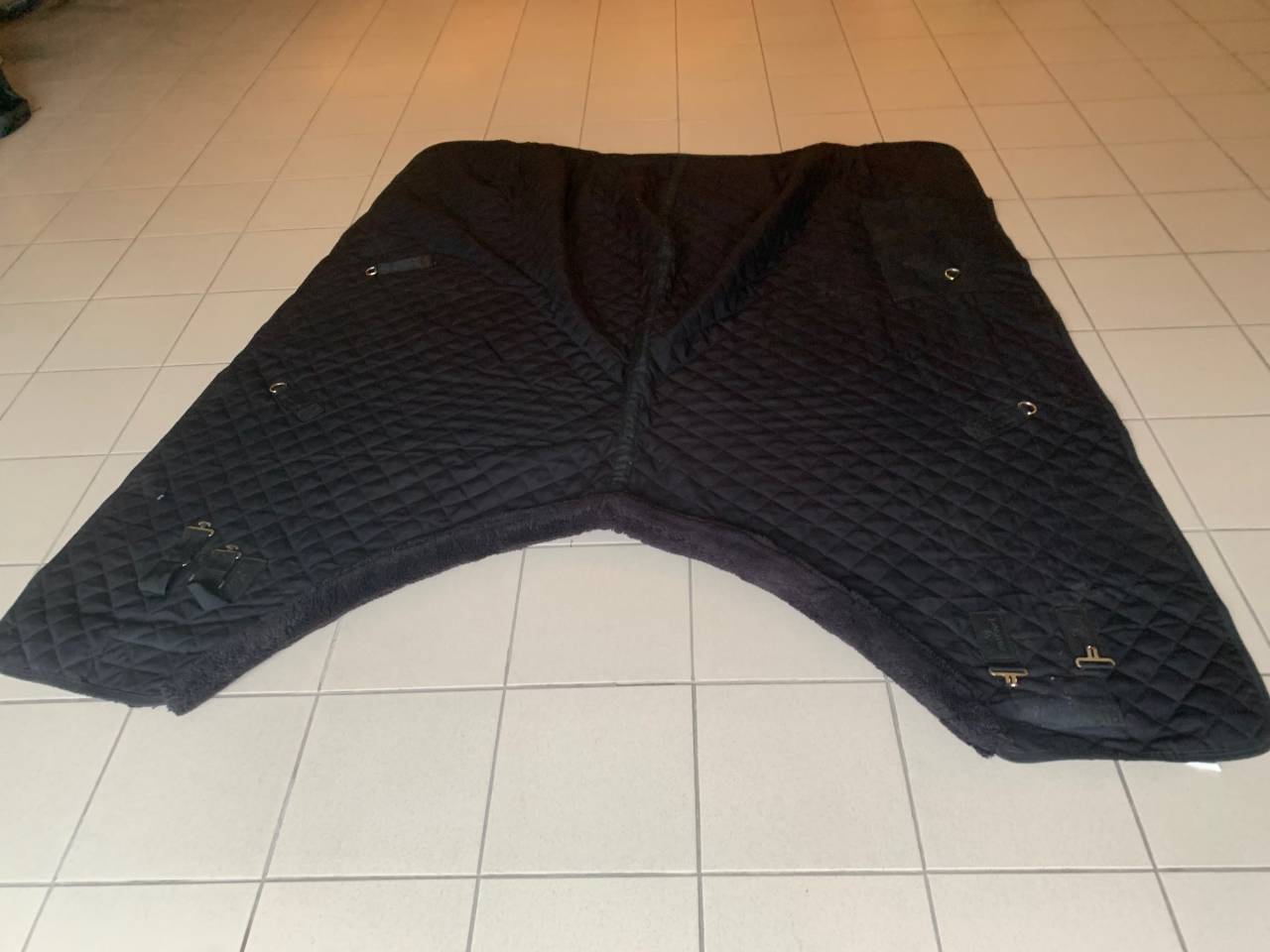 vend couverture noire kentucky 155 cm 150 gr parce que mon cheval est dehors maintenant. J'ai fait installer des courroies de cuisses pour un bon maintien par une couturière . Petit accroc en photo . Sinon très bon état.