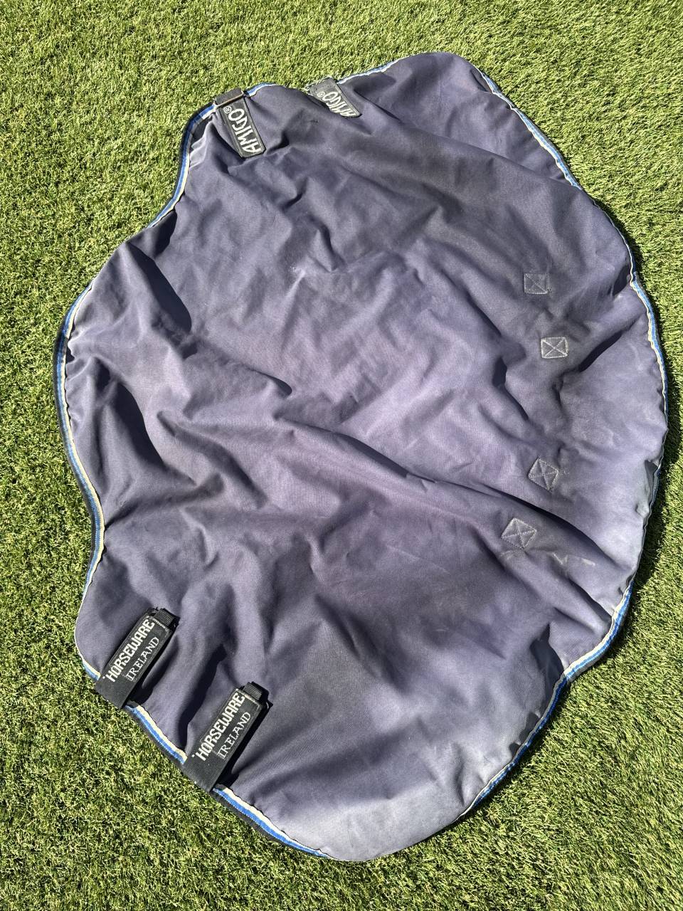 Bonjour, je vends ma couverture horseware bleu marine 250g, elle est en très bon état, seulement des accros qui ont été recousus à l’intérieur du couvre cou mais sinon la couverture est intacte à l’extérieur (hormis que la couleur a tourné).