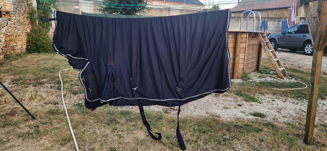 Vends couverture pour cheval EQUI-THÈME, taille 60″ (~150 cm), jamais utilisée, état neuf. Extérieur et doublure 100 % polyester, sangles croisées, boucles de poitrail, courroie de queue et tour de cou. Couleur bleu marine avec liseré clair.