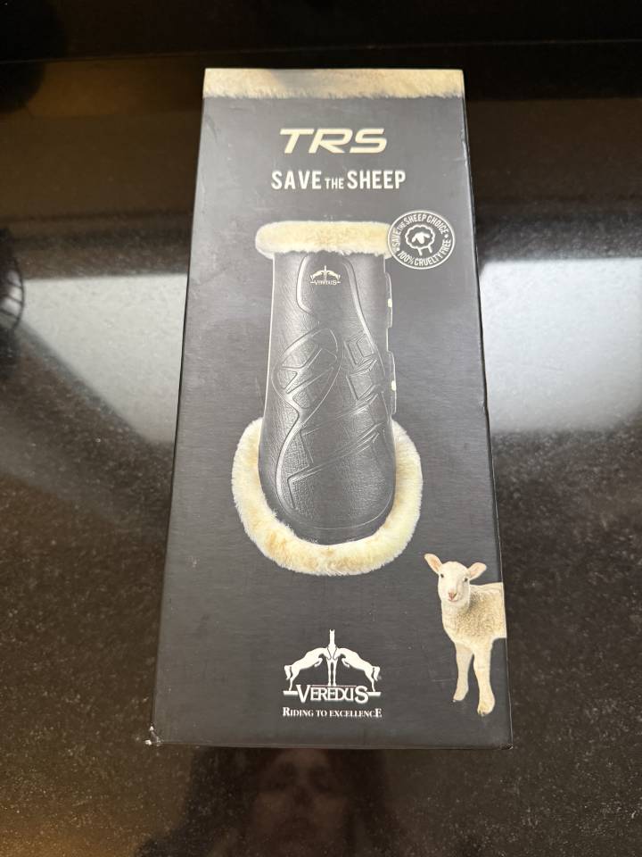 Paire de guêtres antérieurs VEREDUS TRS Save the Sheep, doublées en mouton synthétique (Techno Sheepskin). Waterproof, à double velcro, utilisées une fois, comme neuves, très chic, extérieur noir, doublé écru. Le fabricant annonce : lavage et séchage facile, durabilité et confort.