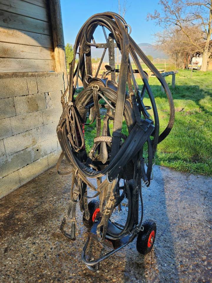 Vendu complet avec une bride, guides, un mors d'attelage Zilco modèle Liverpool taille 145 et un chariot porte harnais
