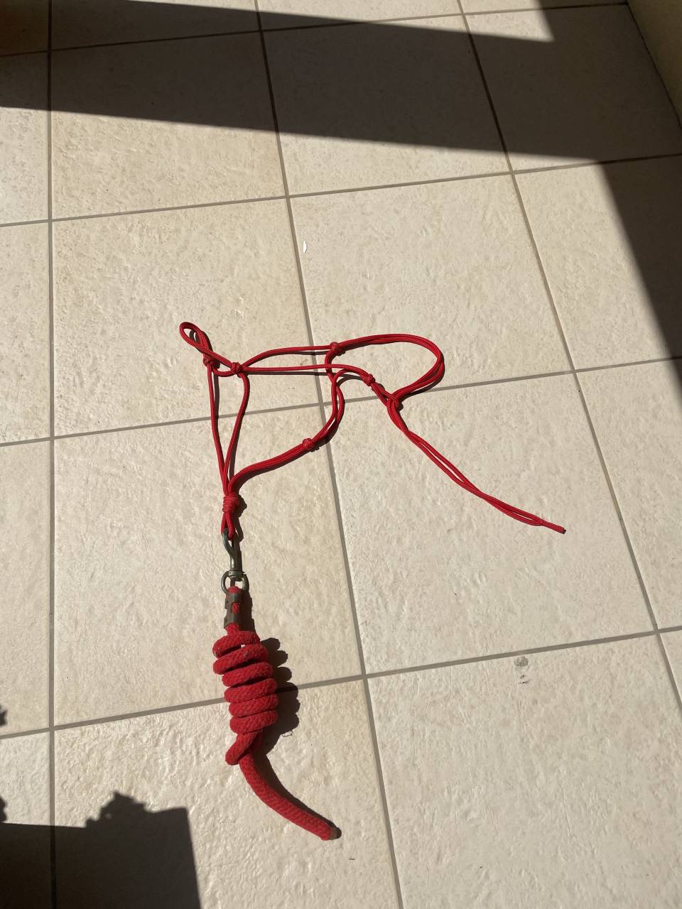 Je vend mon licol en corde avec la longe d'origine, c'est un taille cob mais puisque c'est un licol en corde et qu'il est très réglable il va a pratiquement tous les chevaux des poneys au chevaux qui ont pas d'énorme tête. Le licol est en vraiment très bon état il a servi que quelque fois, les seuls défaut se trouve au niveau du mousqueton de la longe, il a un peu pris l'humidité mais il est parfaitement fonctionnel.