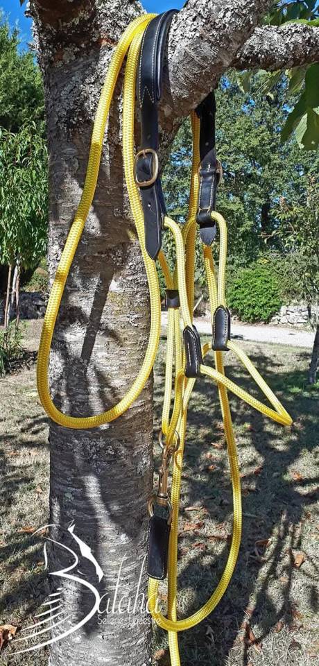 Licol éthologique, cordage marin, cuir pleine fleur, bouclerie laiton. Fabrication artisanale. Vendu avec sa longe de 3m70. Neuf.