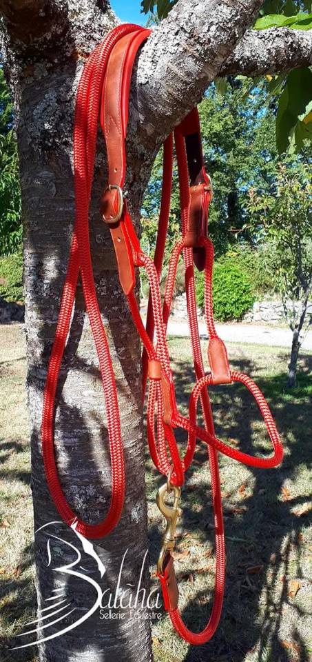 Licol éthologique, cuir pleine fleur, cordage marin, bouclerie laiton, taille cheval, neuf.