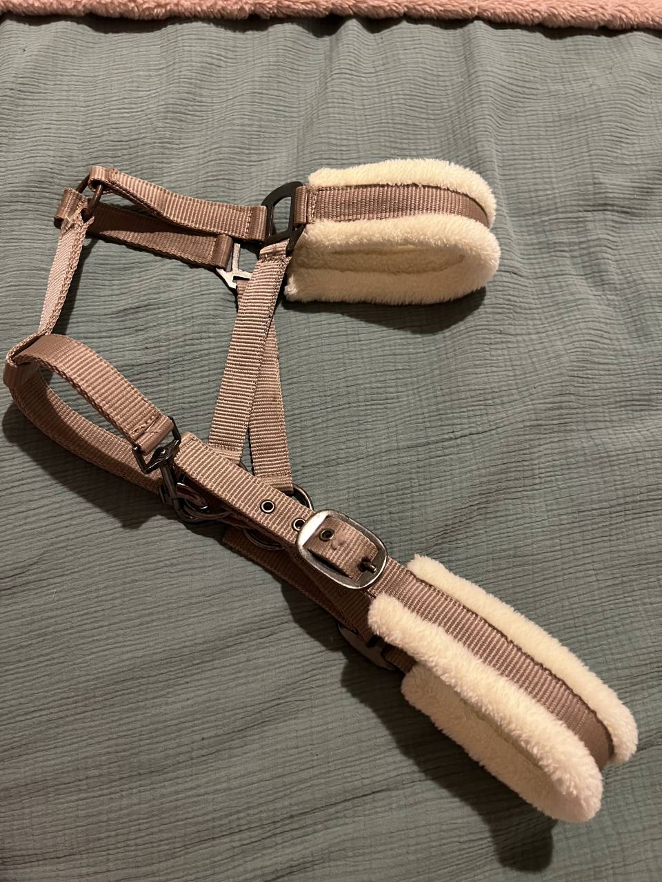 Licol mauve comme neuf, un peu rouillé, la moumoute est comme neuve, il ne possède aucun défaut
