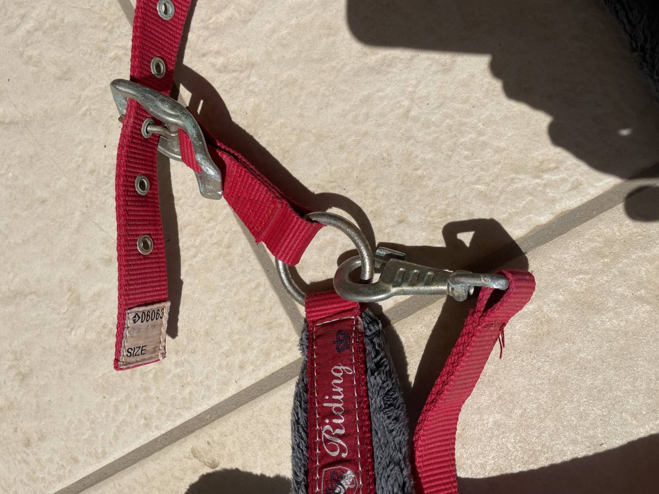 Licol avec moumoute grise fouganza. Le licol est en bon état général c'est un taille full, ses seuls défaut sont que les boucleriez ont un peu pris l'humidité mais elles sont parfaitement fonctionnelle et au niveau de l'attache de tétière j'avais fait un trou en plus pour le rendre plus petit.
