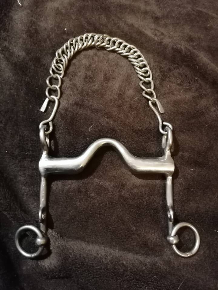 vends mors de brideavec sa gourmette , ,gros canons et grand passage de langue,largeur 135 MM,hauteur des branches 7 cm ,en inox et excellent etat
