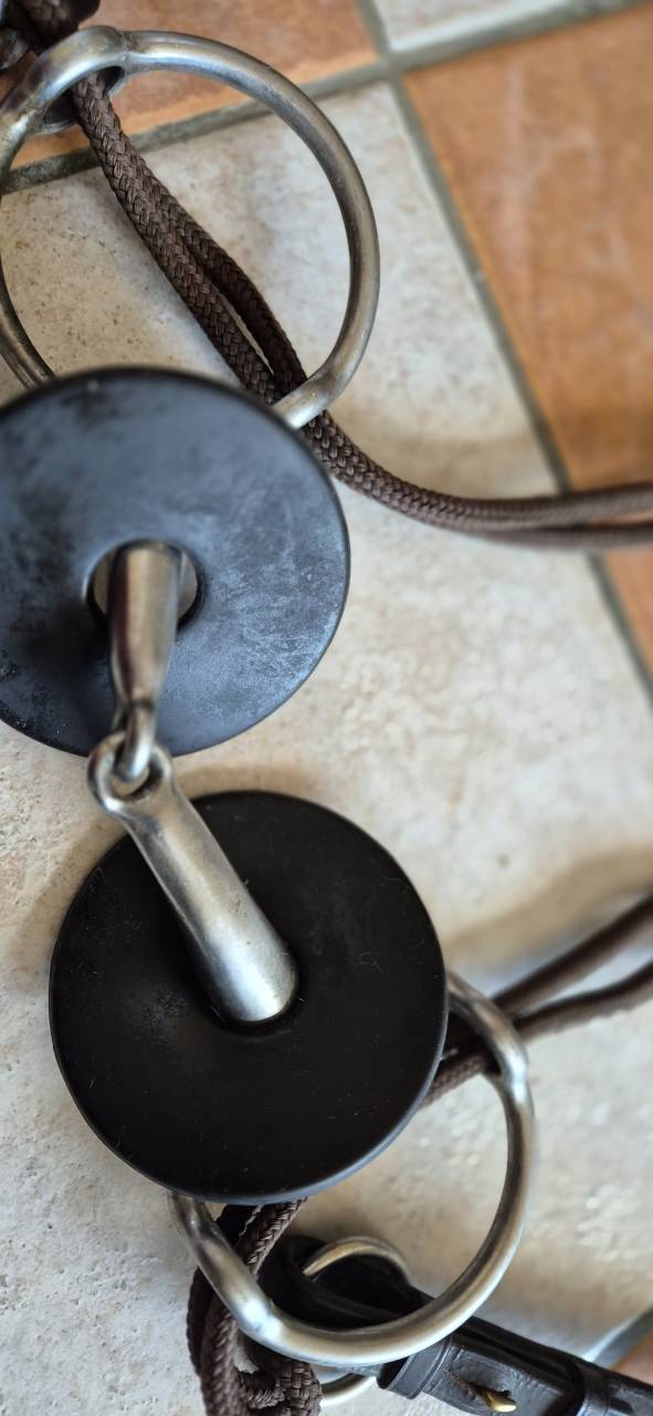 Mors releveur taille 135.Avec rondelles protection caoutchouc et paire de rènes. Havane/noir.