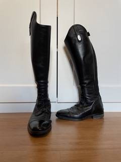 Bottes d'équitation DeNiro, modèle Fildona à bout carré, élastiques sur le devant et le long de la fermeture éclair. Elles sont en très bon état car toujours très bien entretenues avec uniquement du cirage incolore. Elles ont toujours été mises juste avant de monter et retirées juste après le travail.