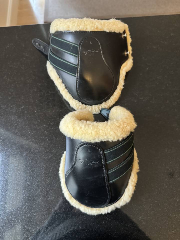 Paire de protège-boulets en cuir noir doublés de mouton véritable de la marque Equipe. Fermeture par élastiques noirs à liserés verts et boutons métal chromé. Taille L. Excellent état, portés une fois. Attaches et mouton comme neufs, marques sur le cuir presque invisibles.