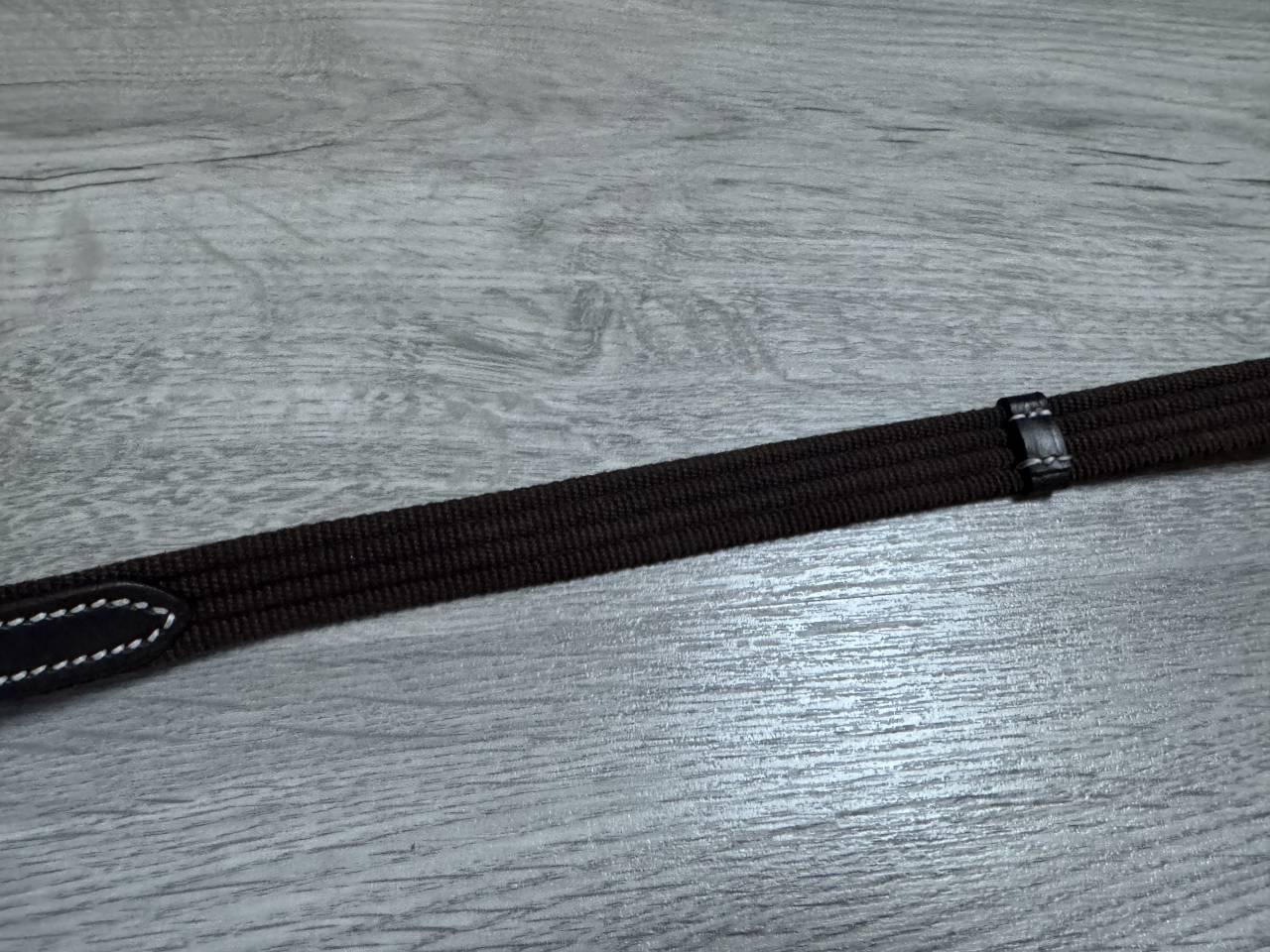 rêne complètement neuve, jamais utilisée, en tissu marron. taille full.