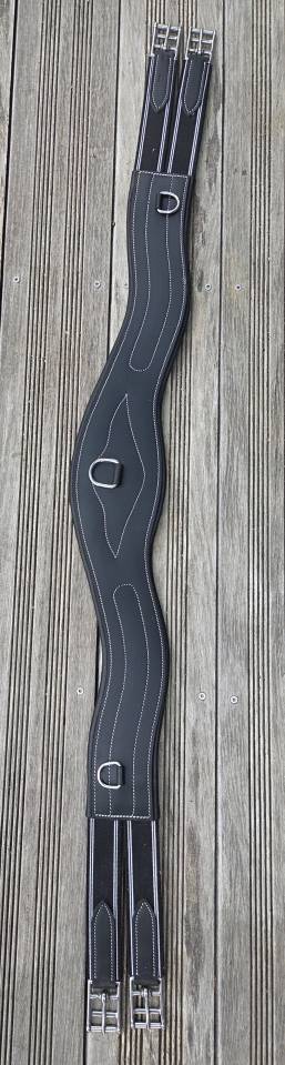 Sangle QHP anatomique avec surpiqûres blanches avec élastiques des deux côtés en cuir noir. Rembourée pour plus de confort. 3 anneaux, un en dessous et un de chaque côté pour les enrènements
