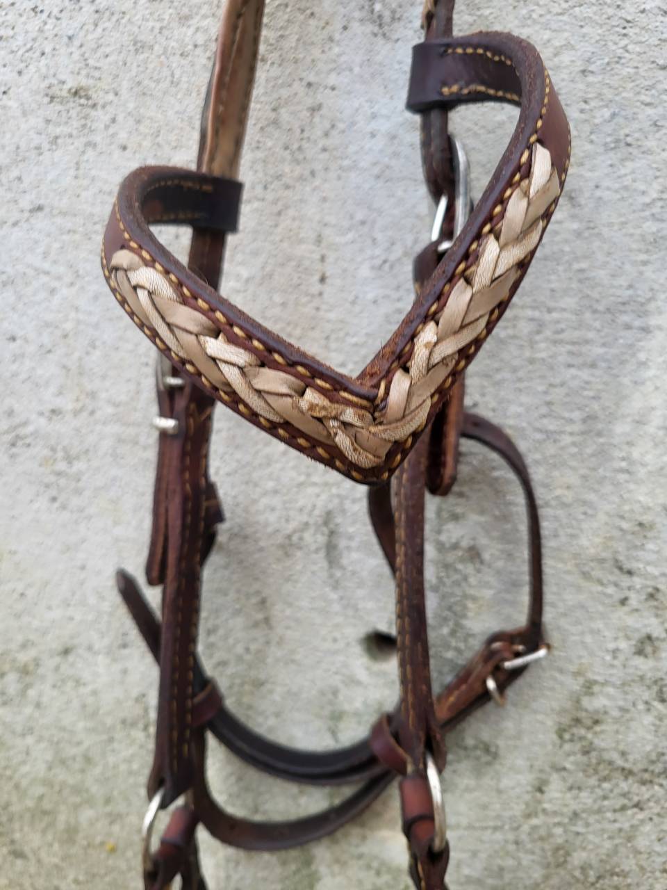 C'est une pièce de facture artisanale avec des tressages bicolore sur le frontal et la muserolle.