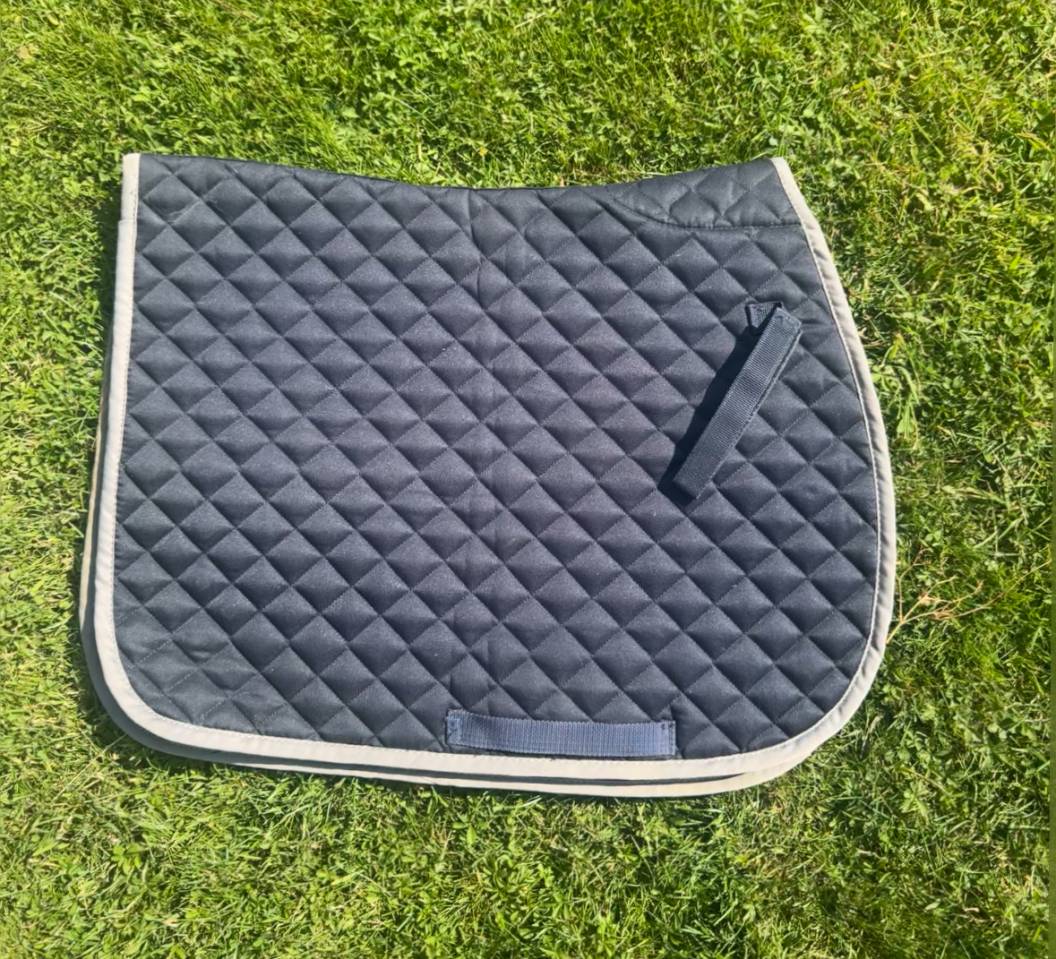 Tapis de selle mixte couleur bleu marine, sobre et élégant, idéal pour l’entraînement ou les sorties. Matelassage en losanges, attaches solides, bordure grise. Convient pour la plupart des selles mixtes ou de saut.