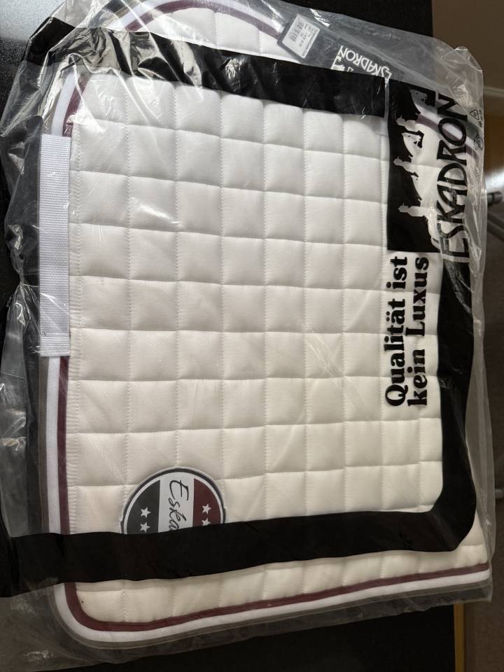 Tapis de selle mixte/CSO Eskadron blanc, matelassé carré, orné d'un bel écusson Eskadron, bordé d'un quadruple liseré bordeaux/blanc/brun/noir assorti à l'écusson. Neuf, avec étiquette et emballage d'origine.