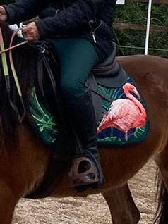 Ce tapis de selle original à motif flamant rose est de taille cheval. Va très bien aussi sur un Cob.