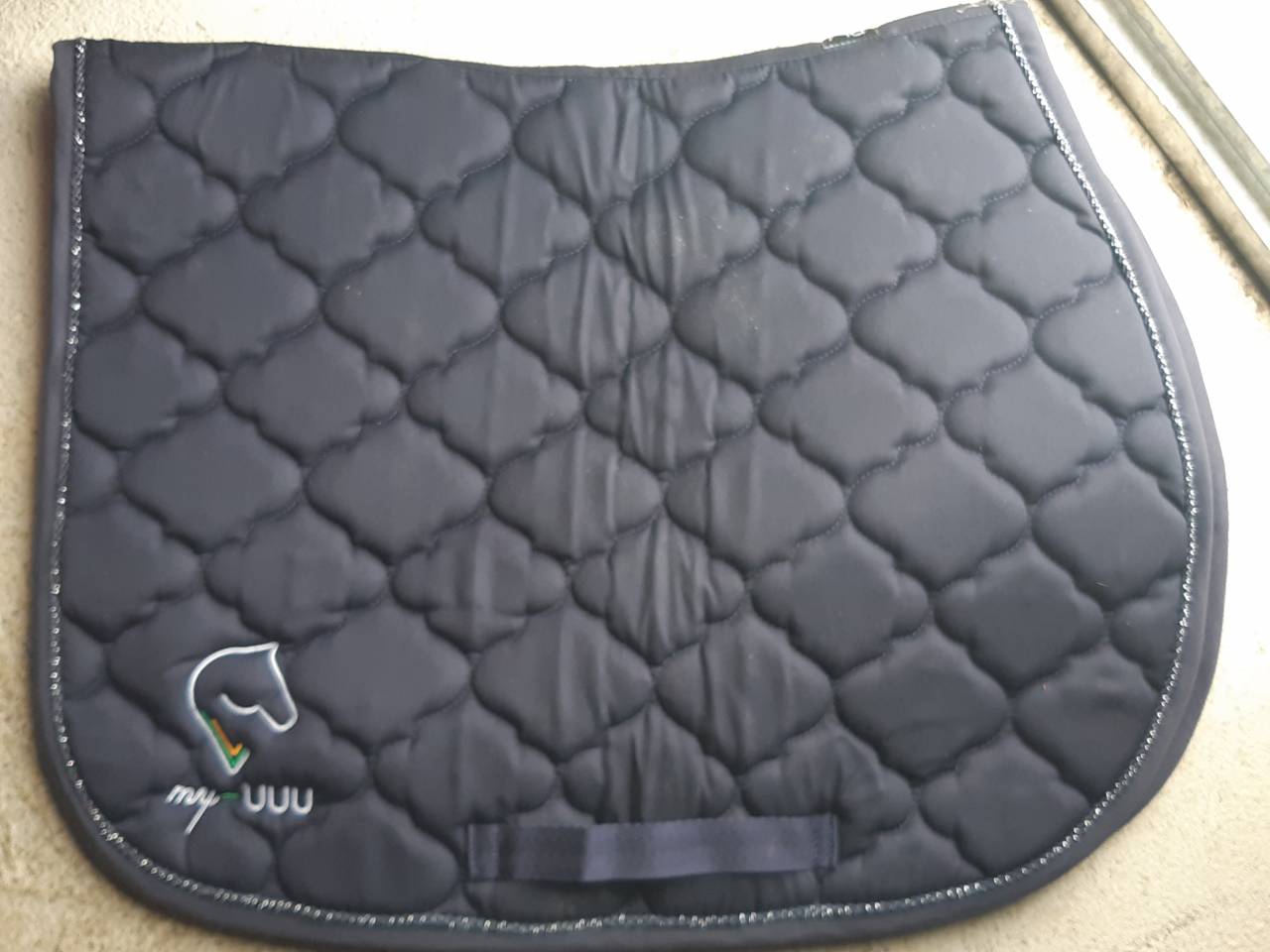 je vente ce tapise de selle, taille poney, couleur bleu marine. logo my-uuu sur un coté. il est neuf