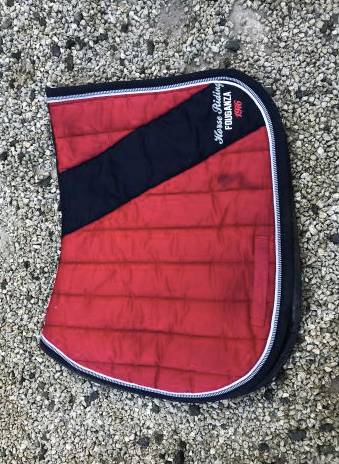 Je vends un tapis fouganza rouge et bleu marine en taille cheval.