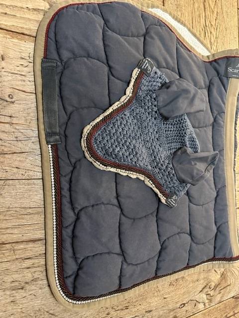 SUPERBE TAPIS ET BONNET ANNA SCARAPATI GRIS BLEU BEIGE BORDEAUX ET STRASS