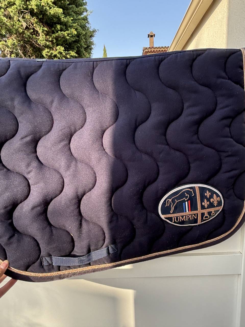 Tapis Jump’in bleu marine avec liseré et surpiqûres rose gold.