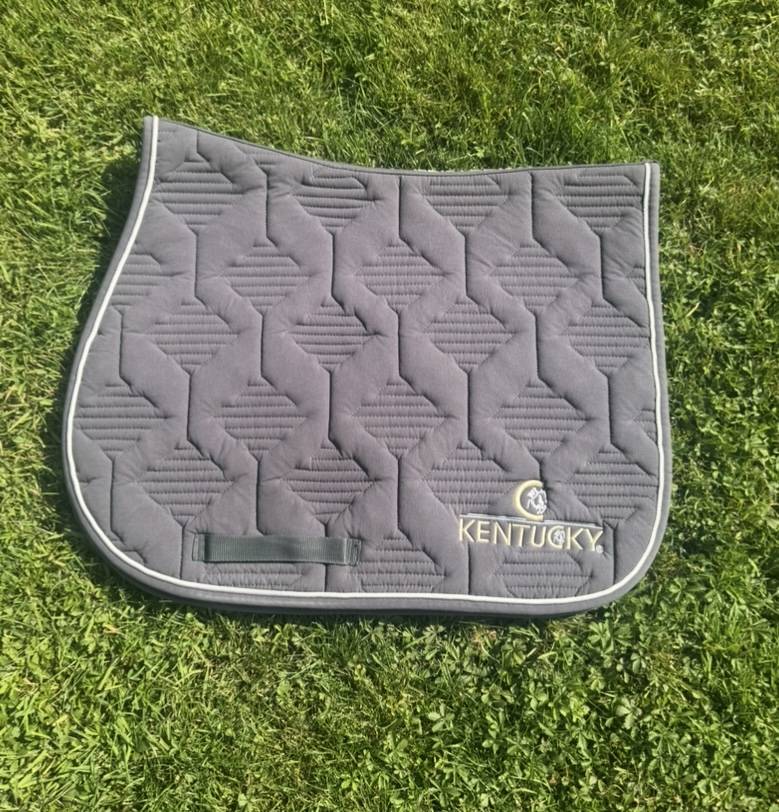 Tapis de selle Kentucky gris sobre avec surpiqûres géométriques, logo brodé sur le côté. Forme mixte, adapté pour un usage quotidien ou les concours.