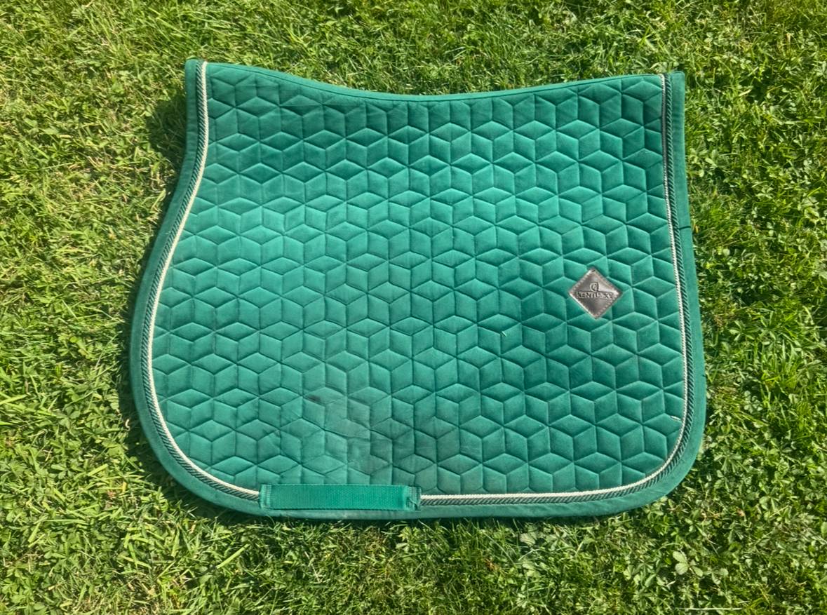 Sublime tapis Kentucky en velours vert émeraude, surpiqûres en motifs 3D hexagonaux. Très confortable pour le cheval et superbe visuellement.