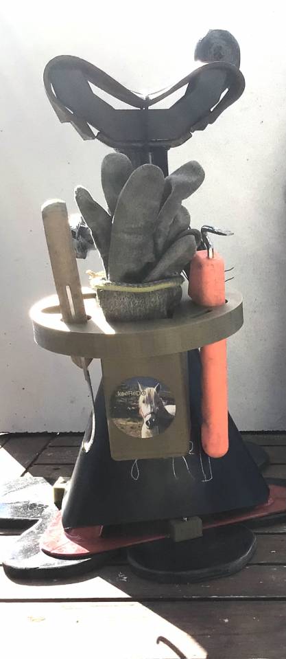 Trépied d'excellence complet pour parage et tout soins des pieds , constitué de trois étages : *Etage supérieur pour la pose du pied , soit pour abord de face plantaire (ligne blanche , sole , fourchette , barres , glomes , ...) , soit de face dorsale (muraille , chanfrein , ...) ,*Etage Intermèdiaire (porte-instruments rotatif pouvant recevoir curette , rénette , brosse , ...) permetrant d'avoir à portée de main le matériel nécessaire , *Etage inférieur pour l'assise au sol du trépied ( avec empiètement hexapodal très stable) .Trèpied léger (environs 2Kgs). Entreprise et fabrication française .