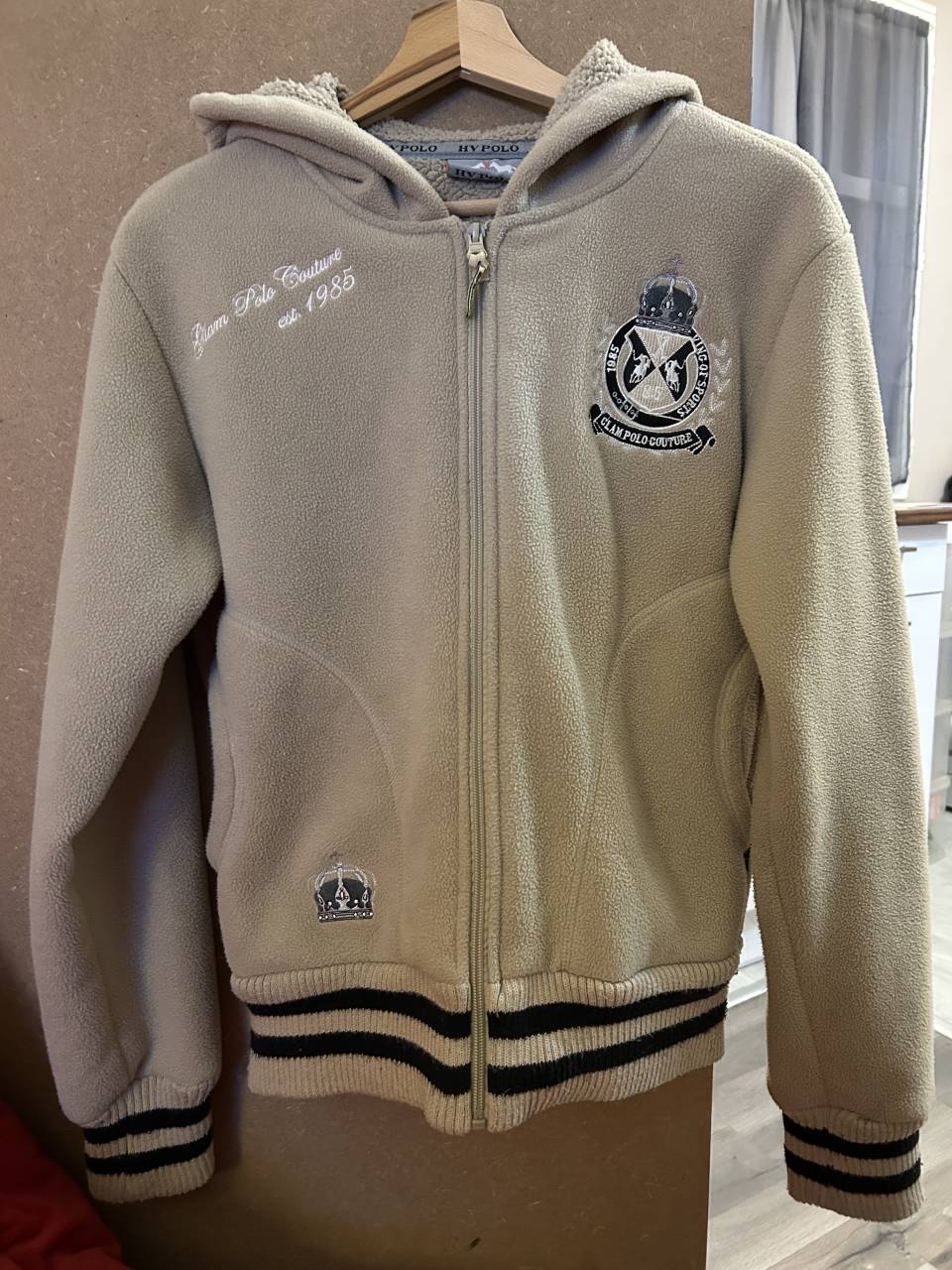 Veste à capuche beige,chaude mi-saison avec texture intérieure en moumoute et extérieure polaire (polyester).