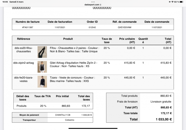Les frais de livraison et de retour sont payés en intégralité par l'acheteur au moment de la commande.