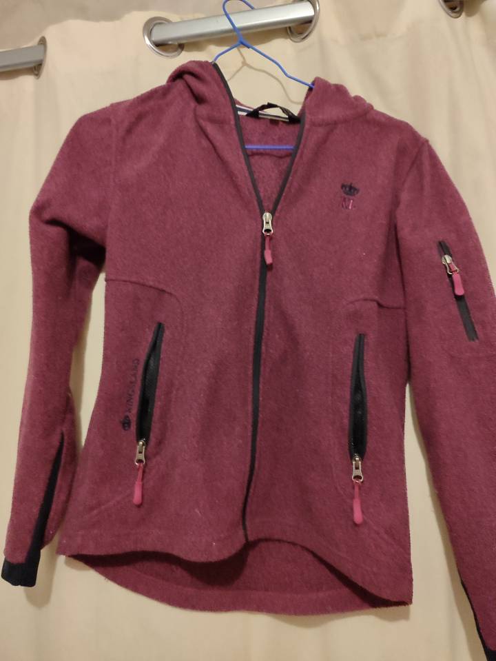A vendre une veste zippée à capuche en parfait état. Couleur bordeaux, taille XS, marque Kingsland.
