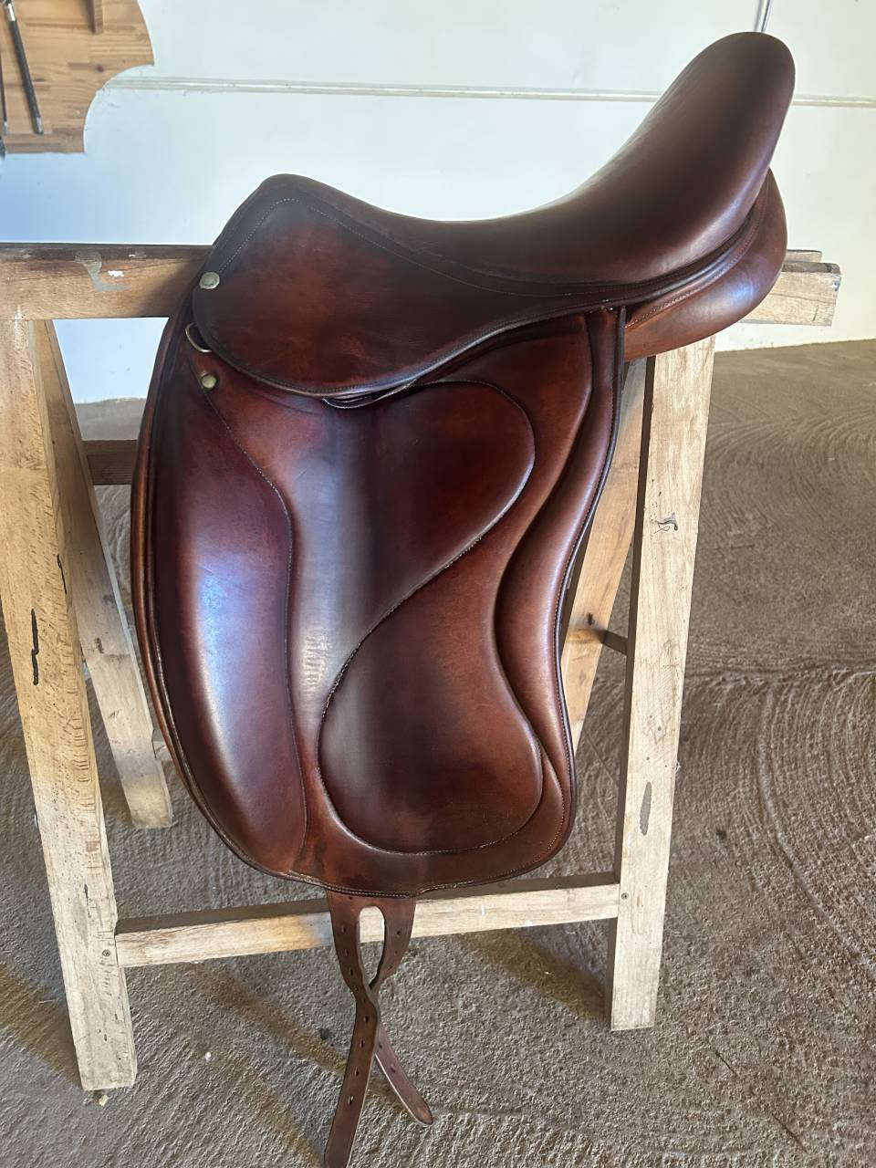 Elle date du début des années 2000, bien entretenue, et conviendrait plutôt à un cheval moins creux du dos, avec un garrot peu saillant (j’ai un PS anglais de 1,68 avec un garrot très saillant et un dos creux/difficile à muscler, la selle est trop “serrée” pour lui au niveau de la gouttière et l’arçon n’est pas assez large).