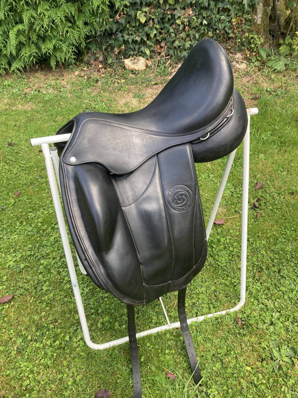 Selle dressage Forestier taille 17,5 première main en bon état. Arcade AN (normale), quartiers 3A, couleur noire avec cuir veau siège et quartiers, taquets avant Atl. Taquets ar CM, panneaux ProD10. Vendue avec sangle courte confort Forestier 50 cm et etrivières dressage taille 1, housse taille L et petit sac Forestier pour savon et graisse.