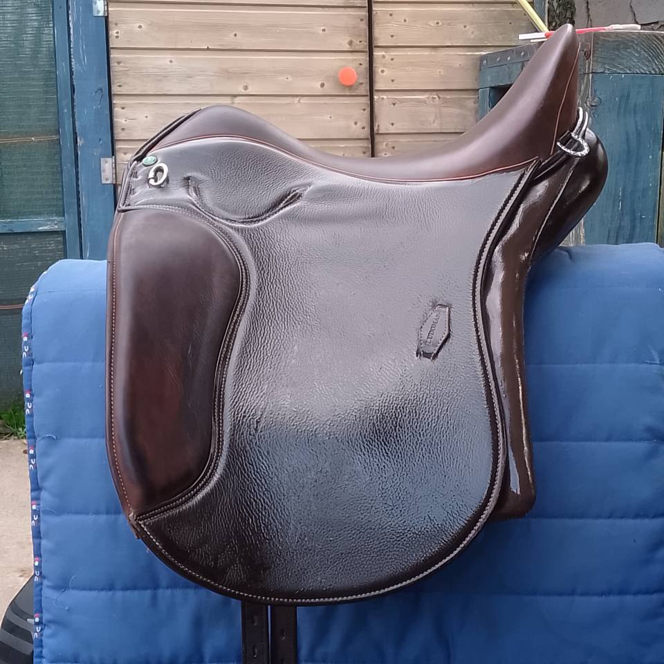 The saddle is in very good condition. It is sold with stirrups, stirrup leathers, a short strap (dressage) and two sets of velcro cleats.